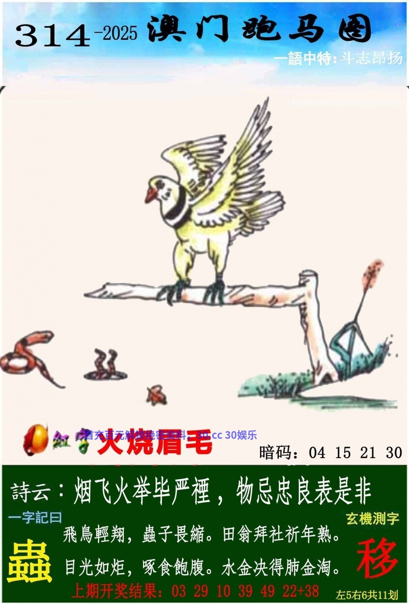 314期:【一字記曰】开:發00 【蟲】 飛鳥輕翔,蟲子畏縮,田翁拜社祈年熟。目光如炬,啄食飽腹,水金决得肺金淘。 解:物忌忠良表是非解蛇马狗鸡虎牛。 生肖:蛇马狗鸡虎牛 |